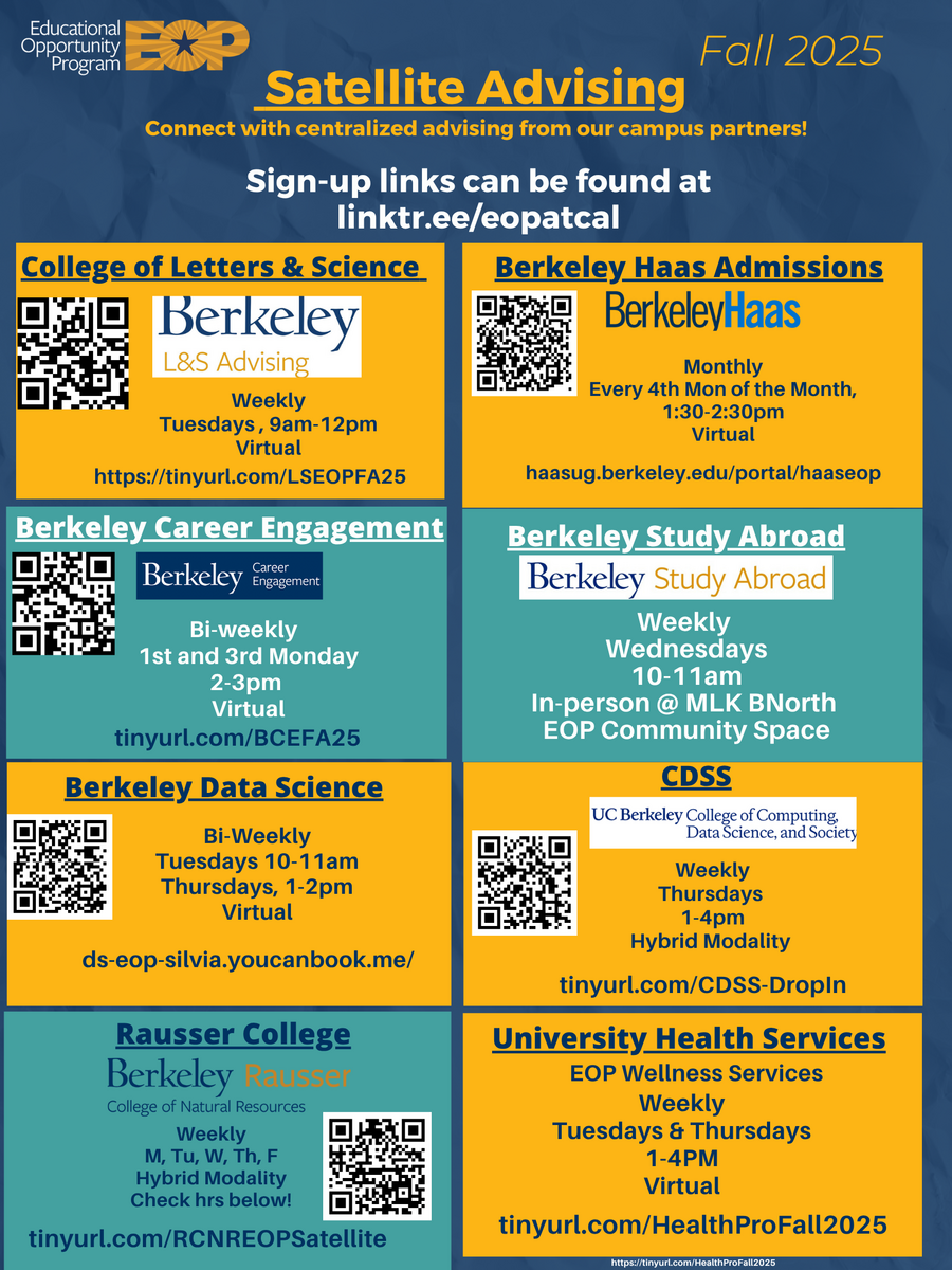 EOP understands that, at times, the university can be a challenging place to navigate for many students. For that reason, every semester we collaborate with a variety of campus departments to bring their advising expertise and unique resources directly to you!